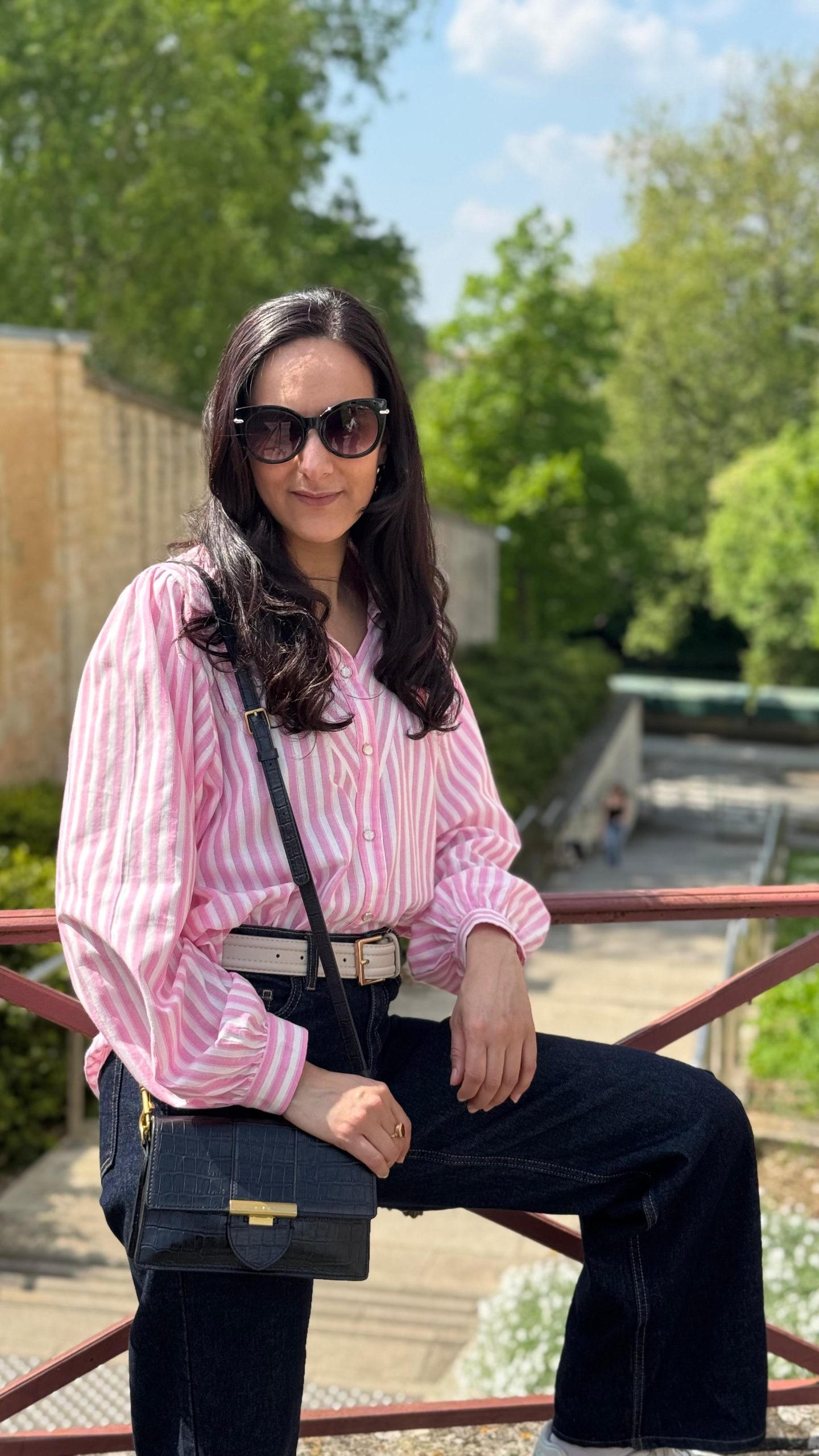Fraîche, élégante et pleine de caractère, cette chemise 100% coton séduit par ses rayures rose et blanc et ses manches froncées bouffantes qui lui donnent un tombé unique.