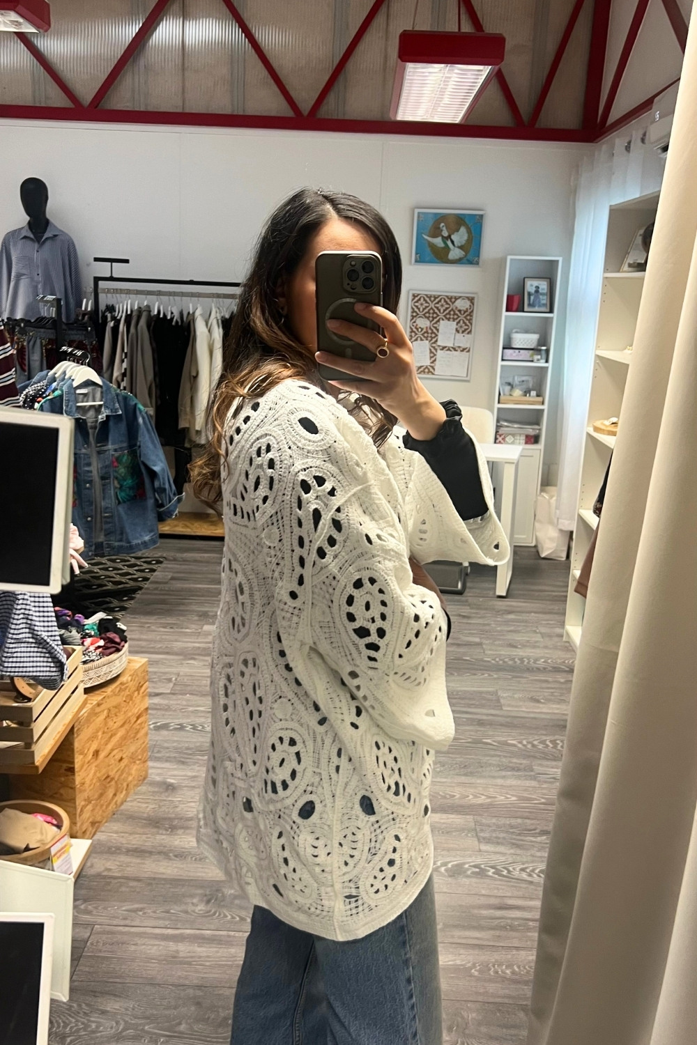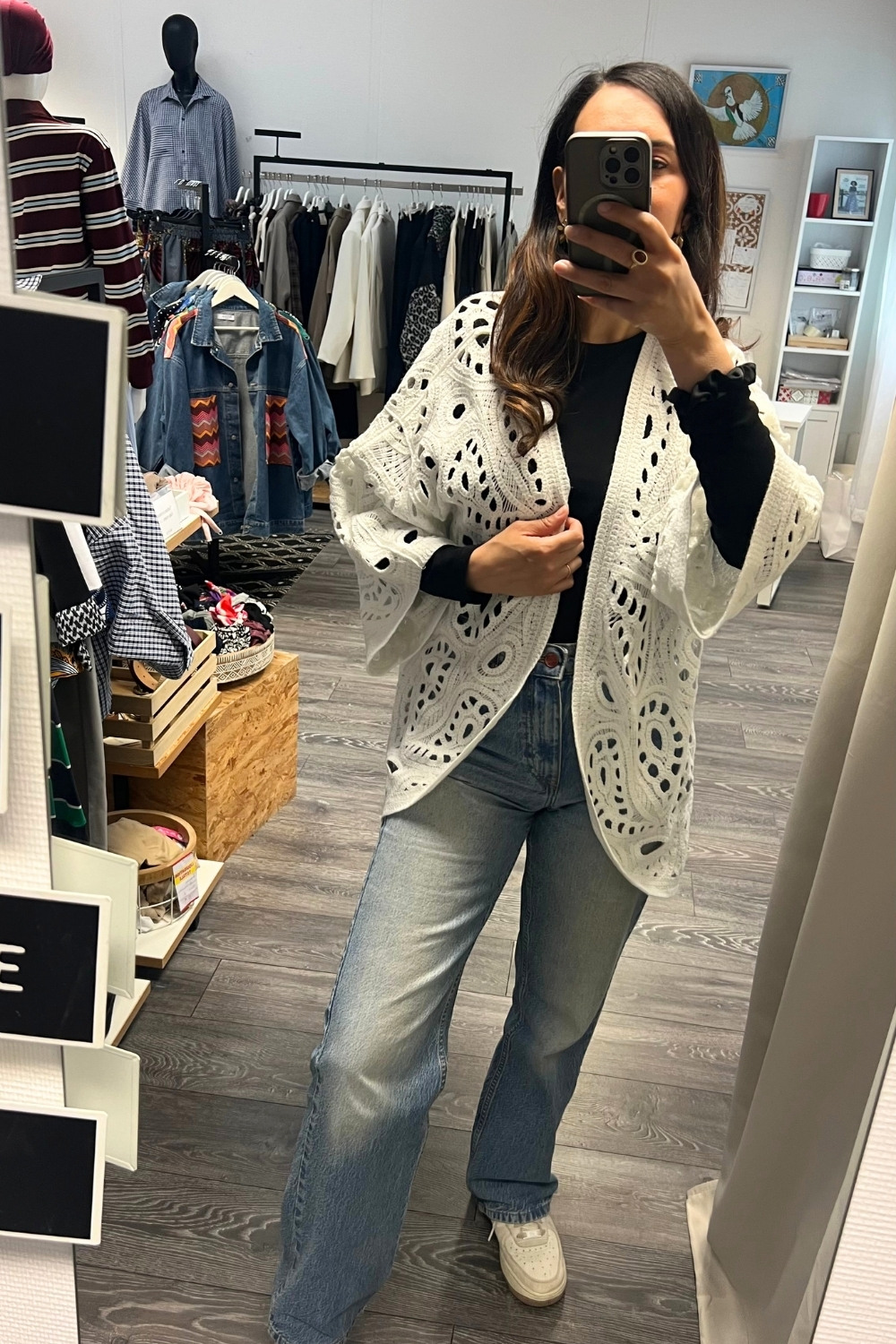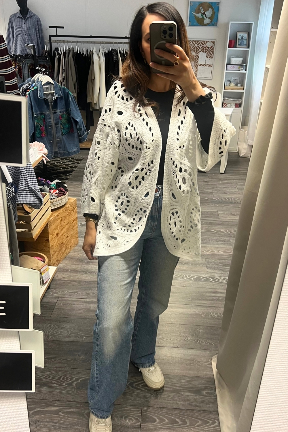 Gilet long oversize en crochet blanc – Style bohème chic | NIYYA Paris