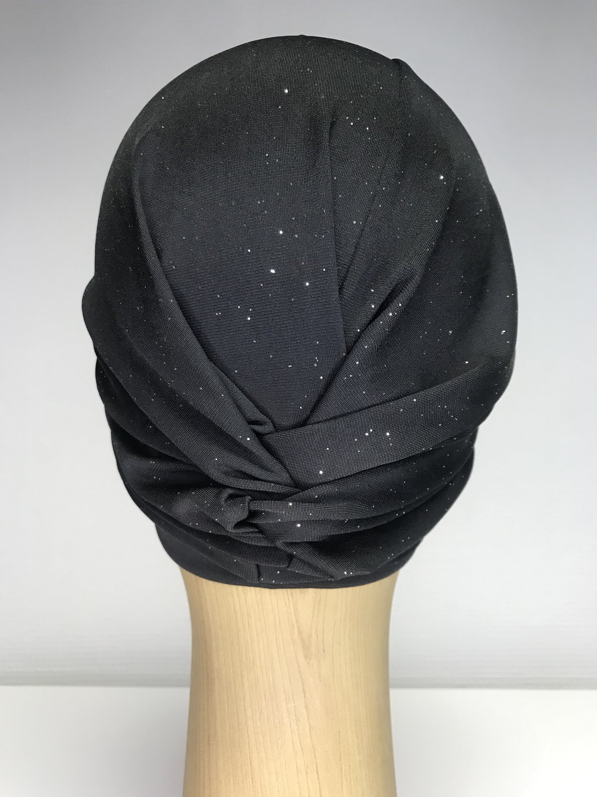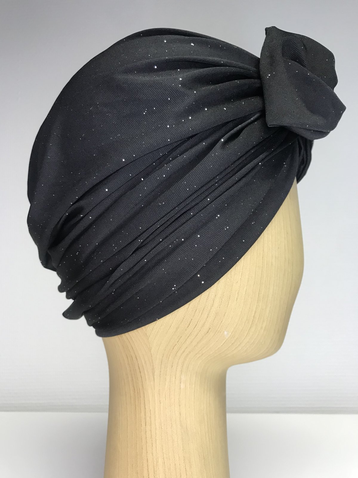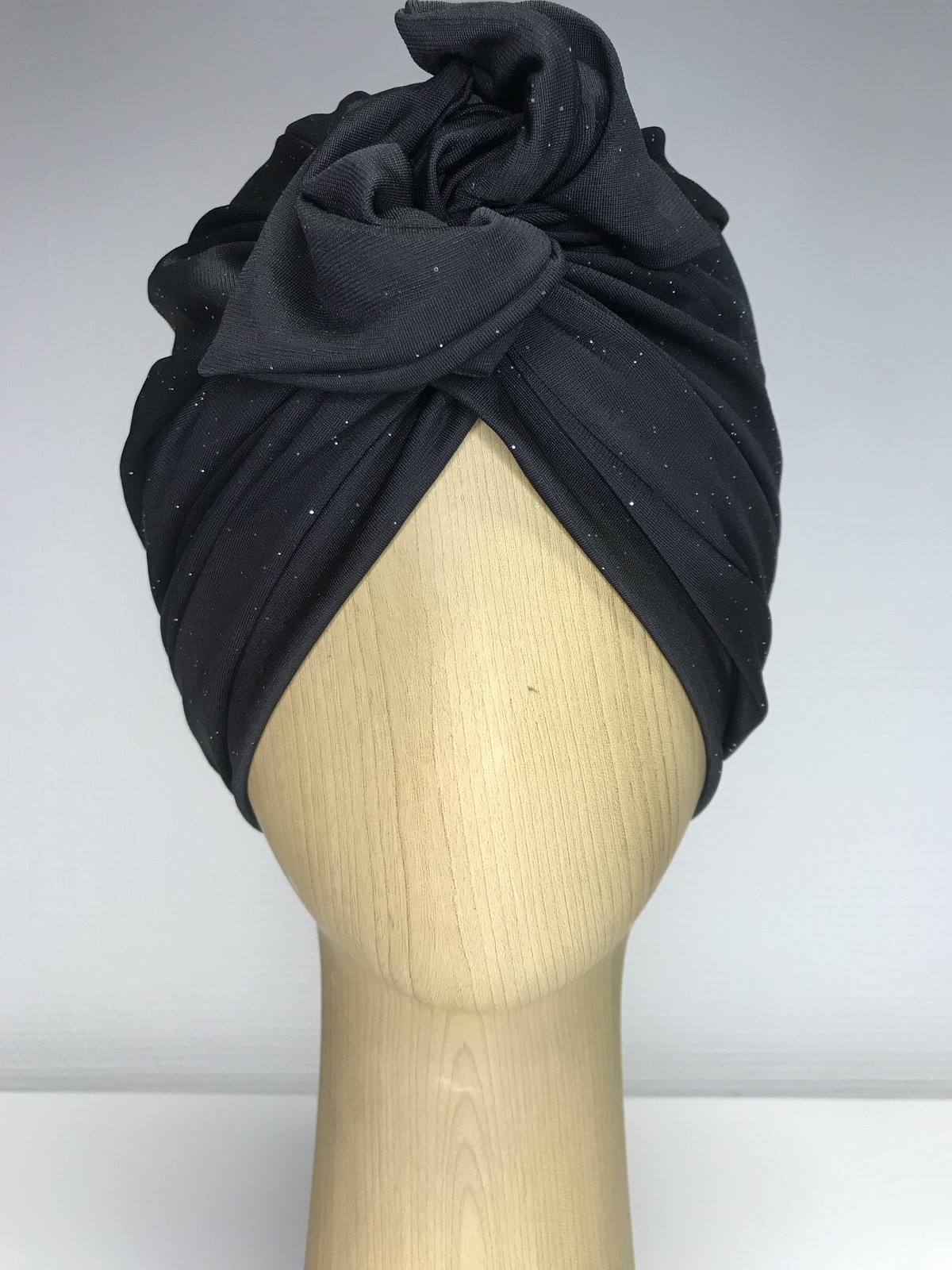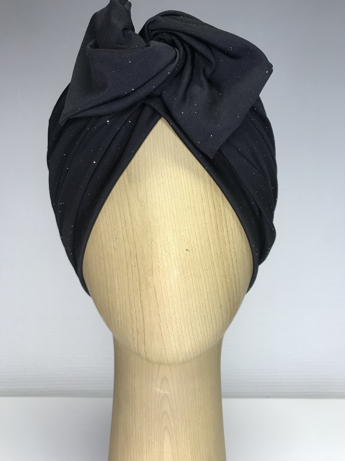 Idée look : à porter cheveux détachés, ou rentrés à l’intérieur du turban avec un chignon et de jolies boucles d’oreilles.