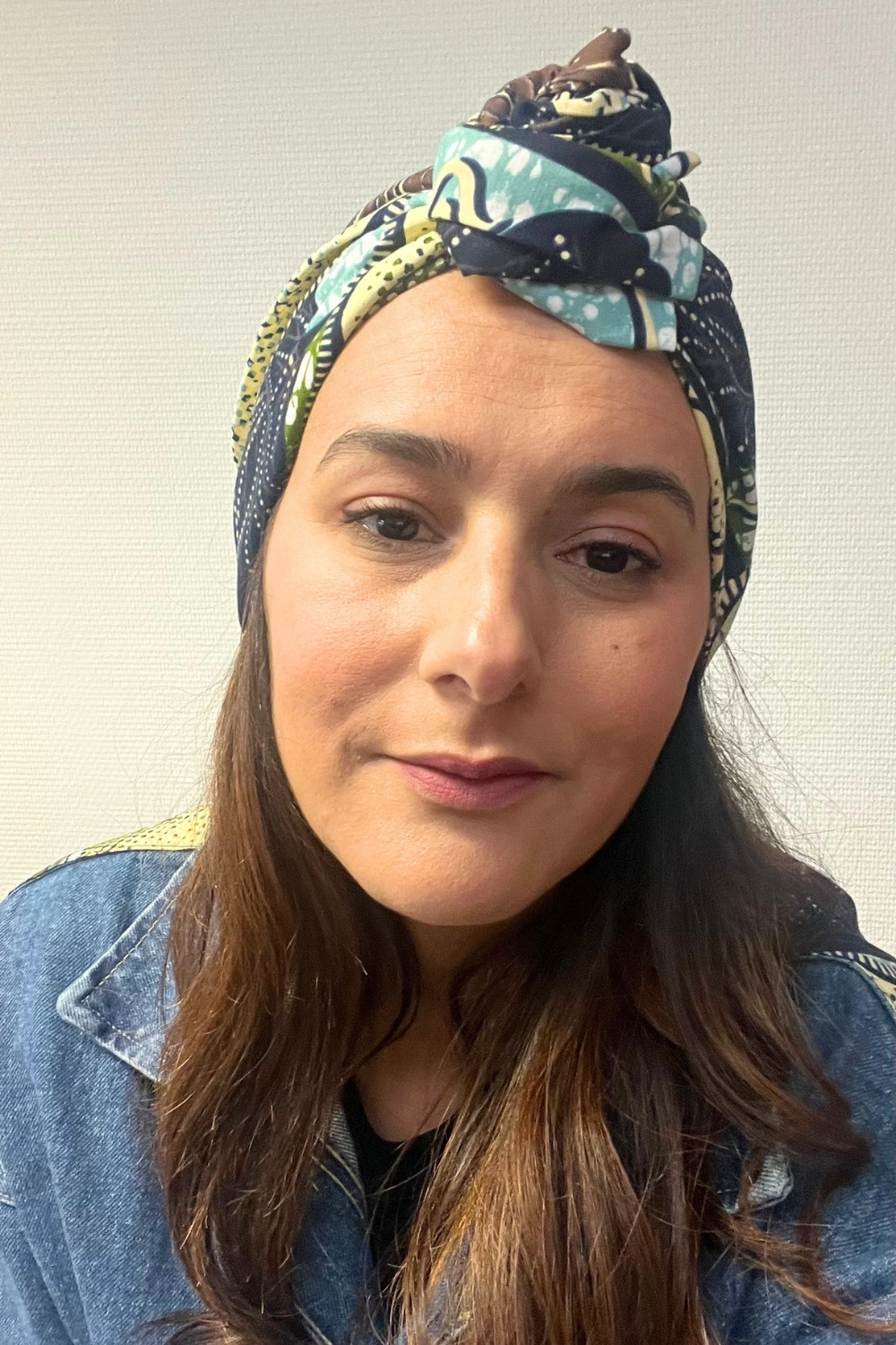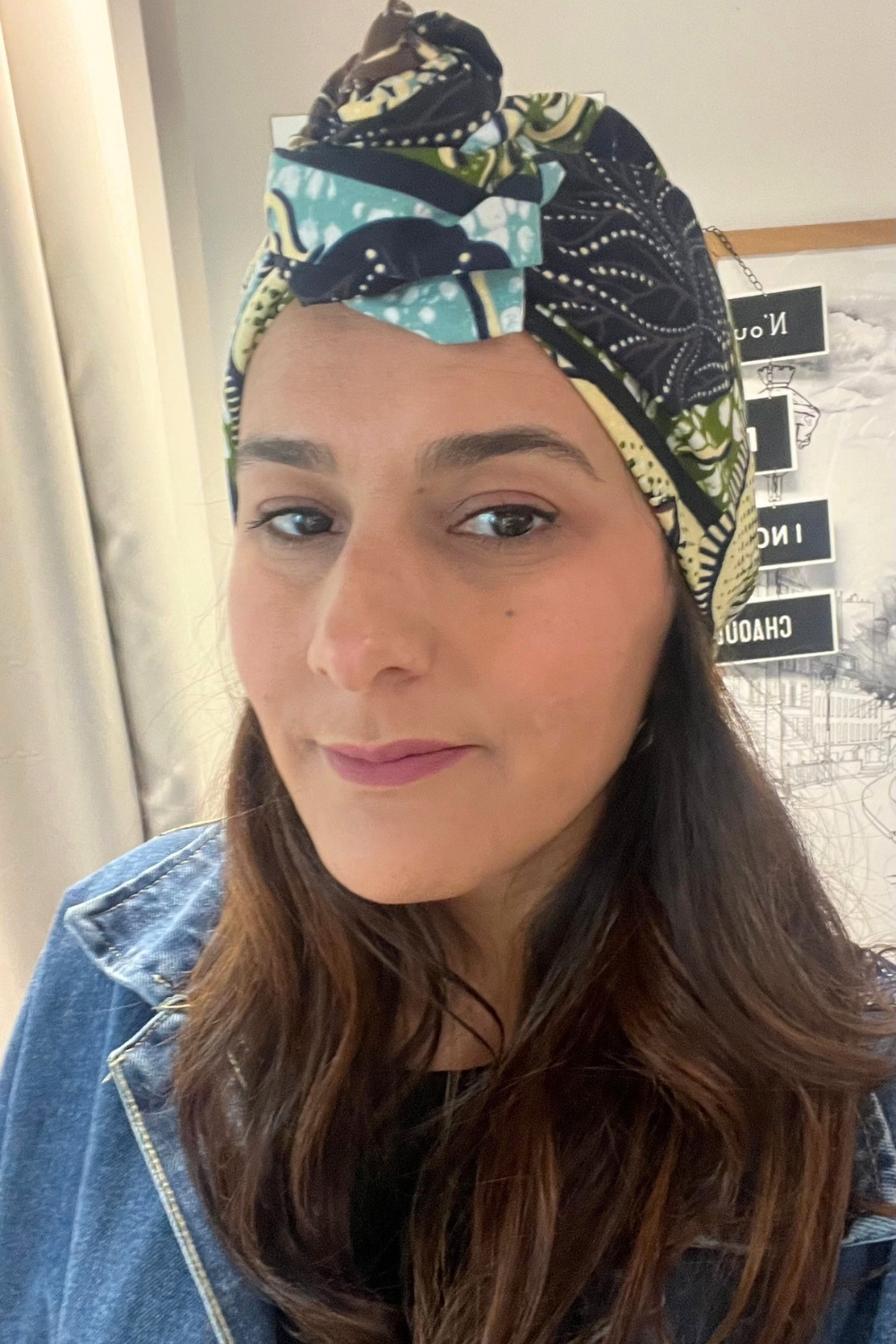 Idée look : à porter cheveux détachés, ou rentrés à l’intérieur du turban wax avec un chignon et de jolies boucles d’oreilles.