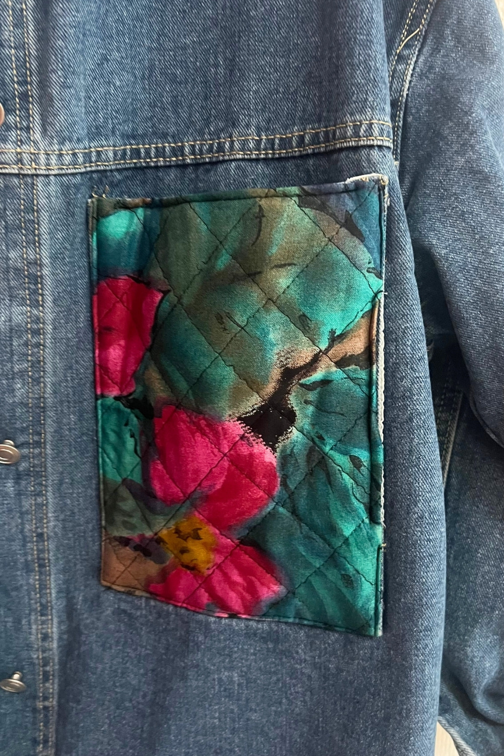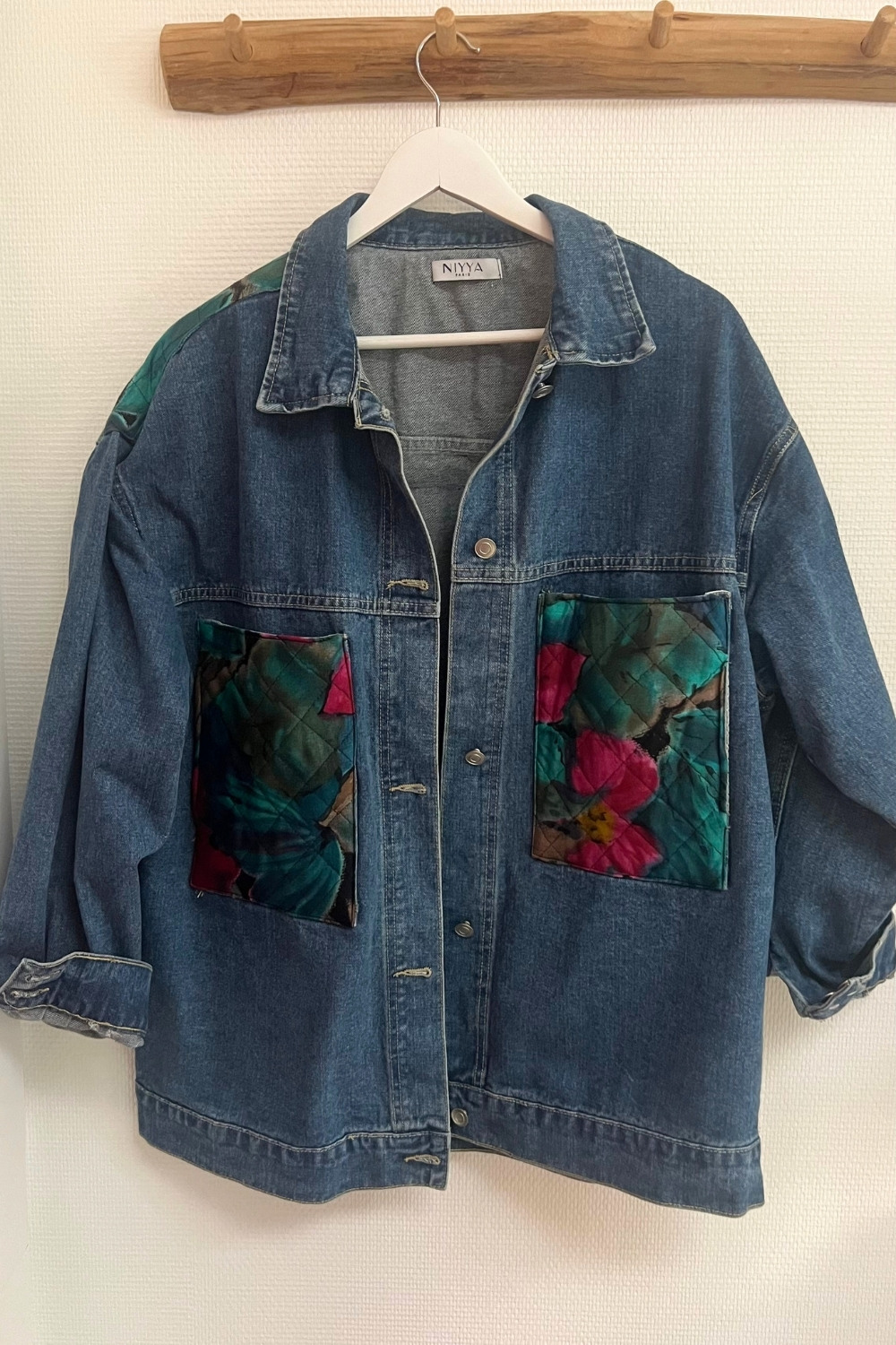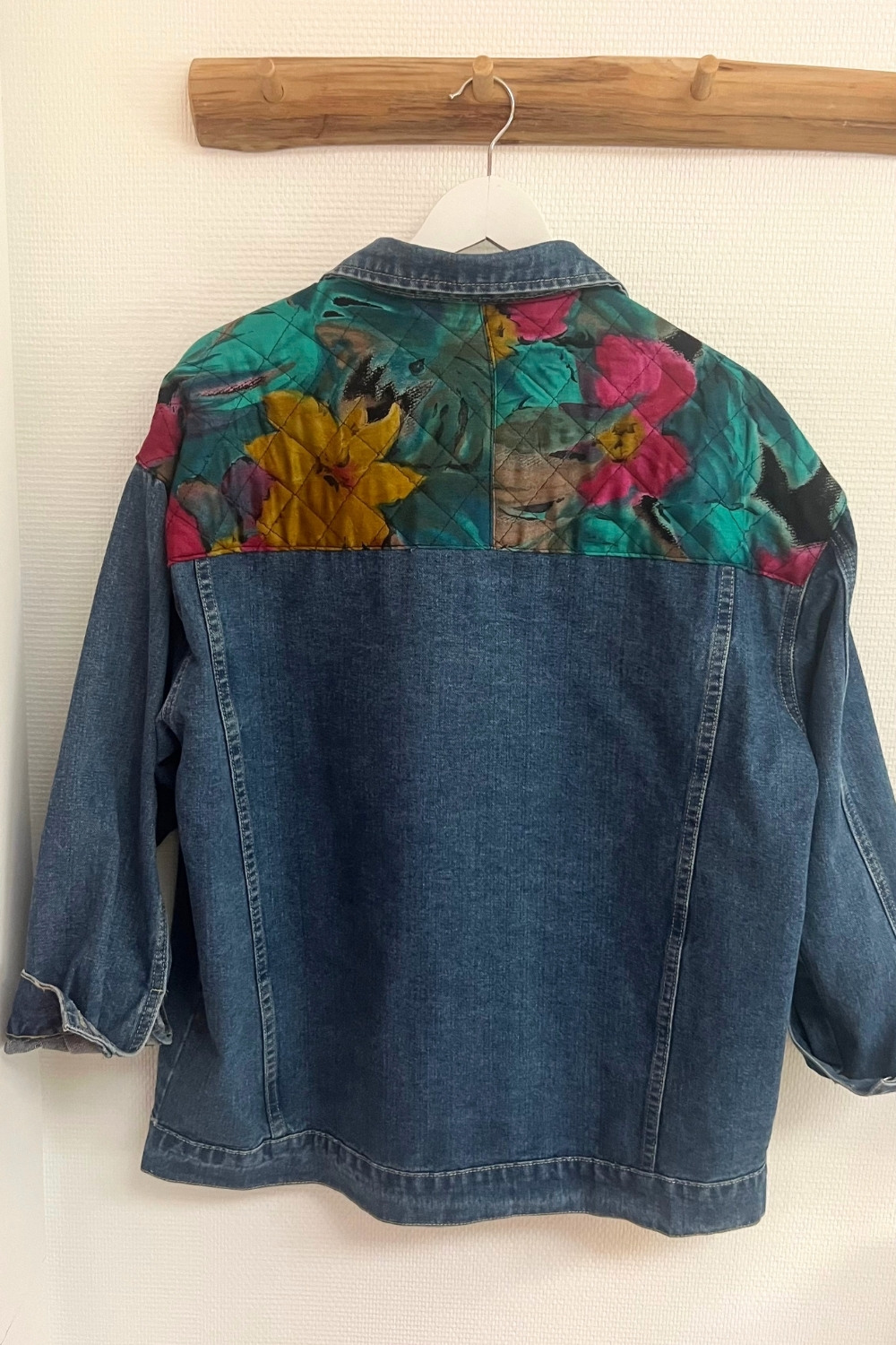 Cette veste en jean bleu foncé oversize est customisée à la main dans le dos et sur les poches avec un tissu aux motifs vert émeraude, rose et jaune. Un contraste vibrant et original, qui fait toute la différence.
