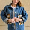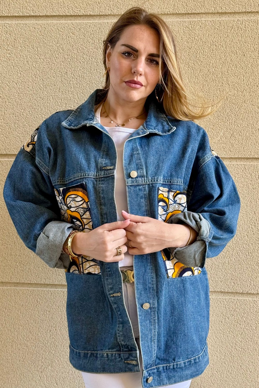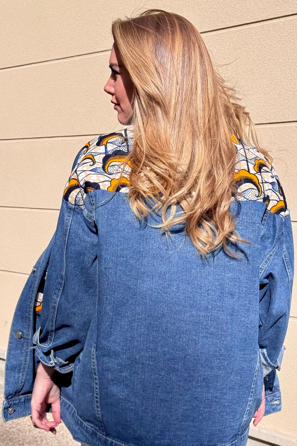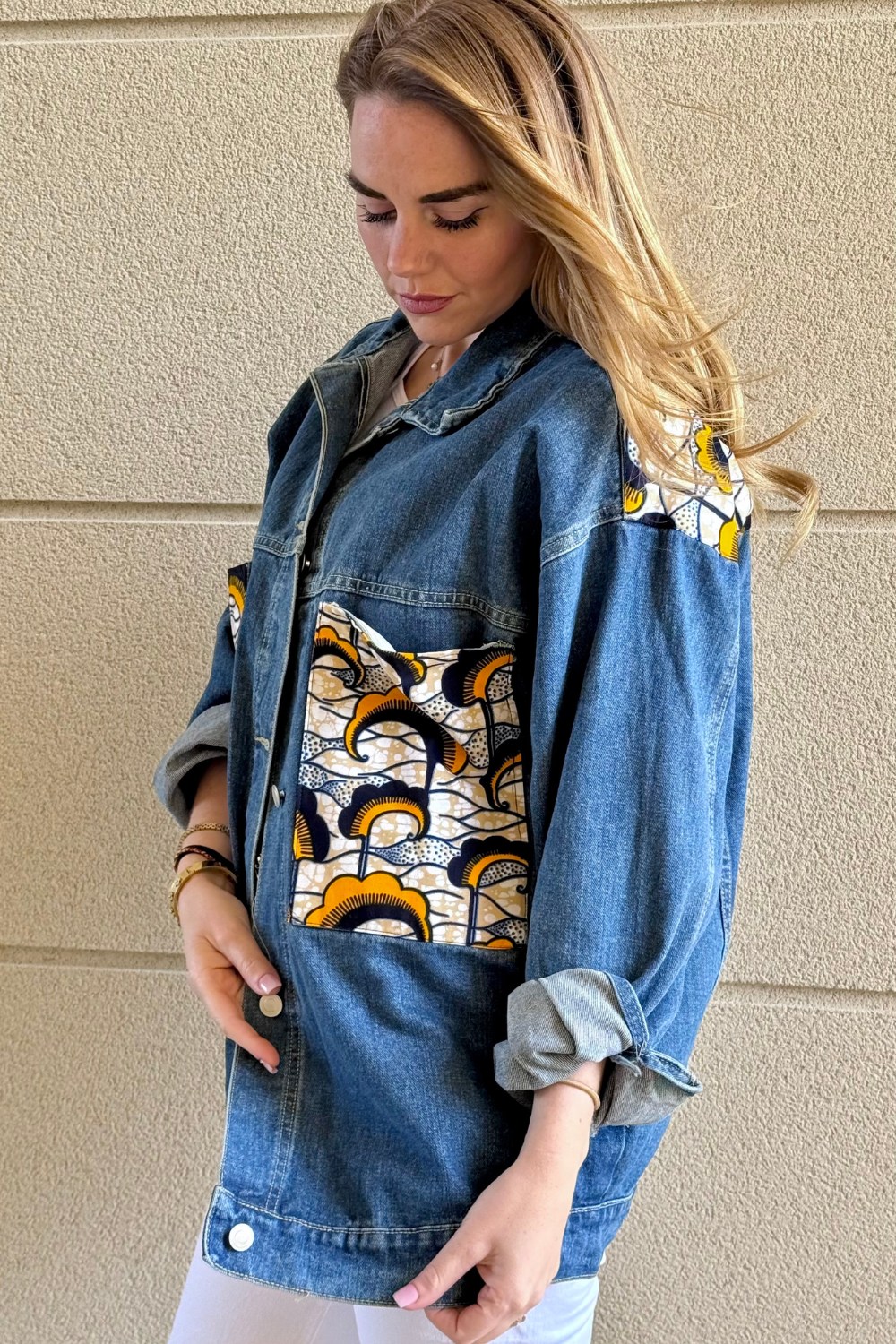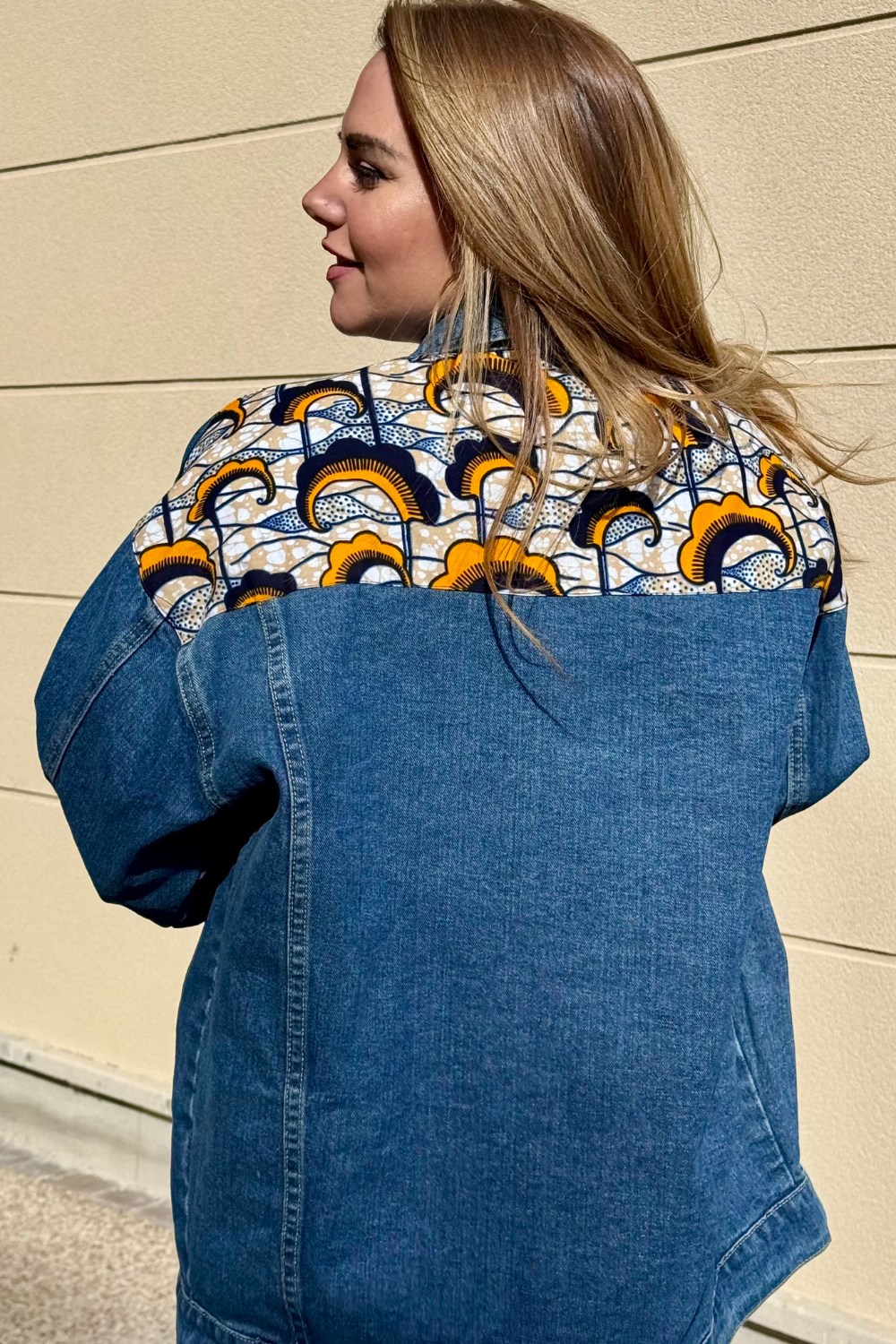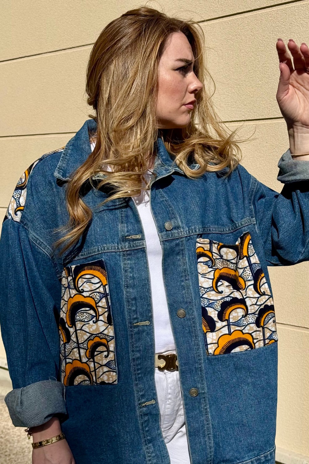 Cette veste en jean bleu foncé oversize est customisée à la main dans le dos et sur les poches avec un wax 100 % coton, aux motifs beige et bleu marine. Un contraste vibrant et original, qui fait toute la différence.