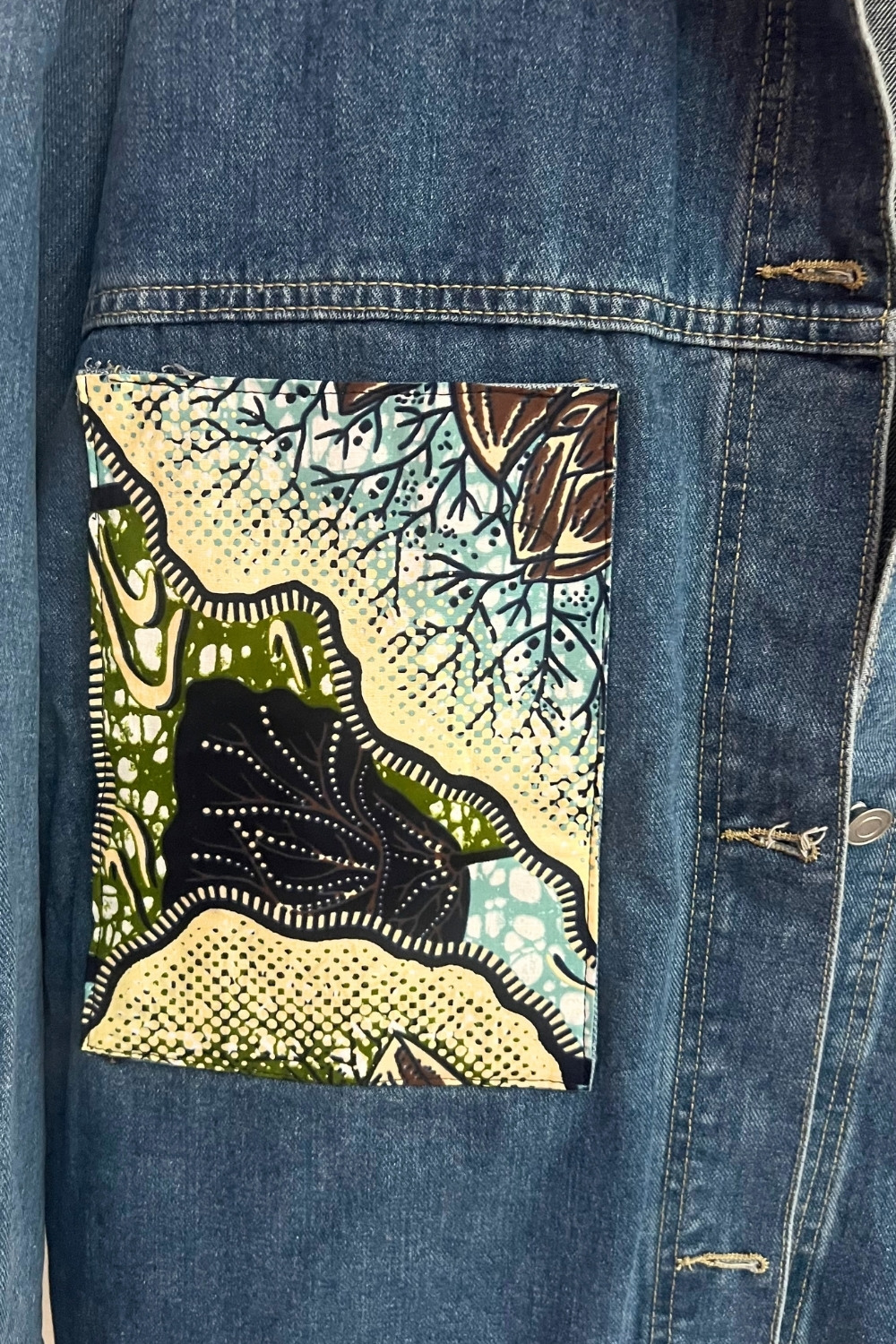 Apportez une touche artistique à votre garde-robe avec cette veste en jean oversize ornée d’un wax aux motifs floraux et organiques. Les teintes vertes, jaunes et noires créent un jeu de contrastes élégant et naturel.
