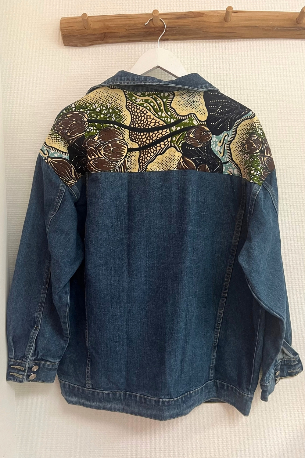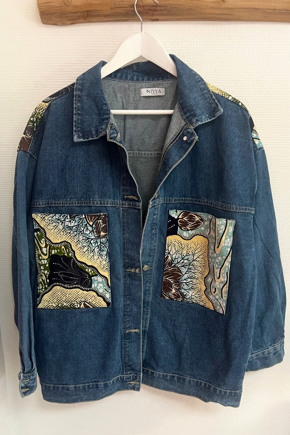 Veste en jean oversize femme – Wax floral vert et jaune | NIYYA Paris