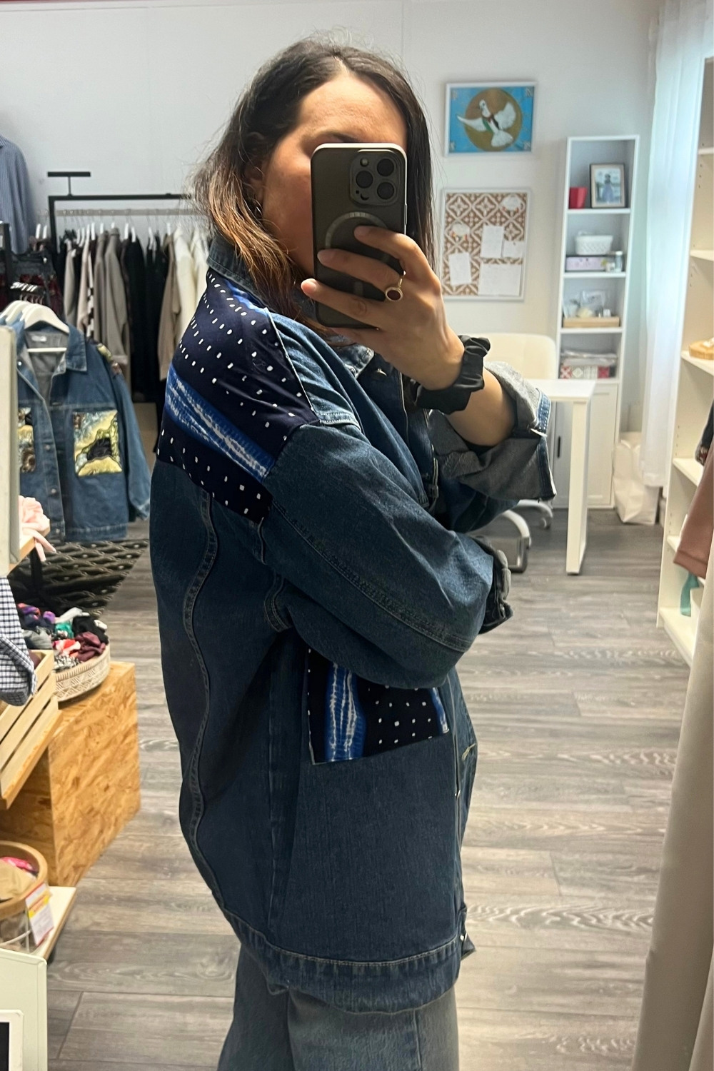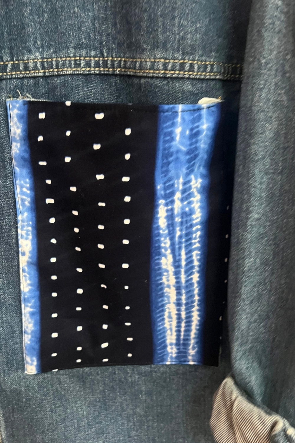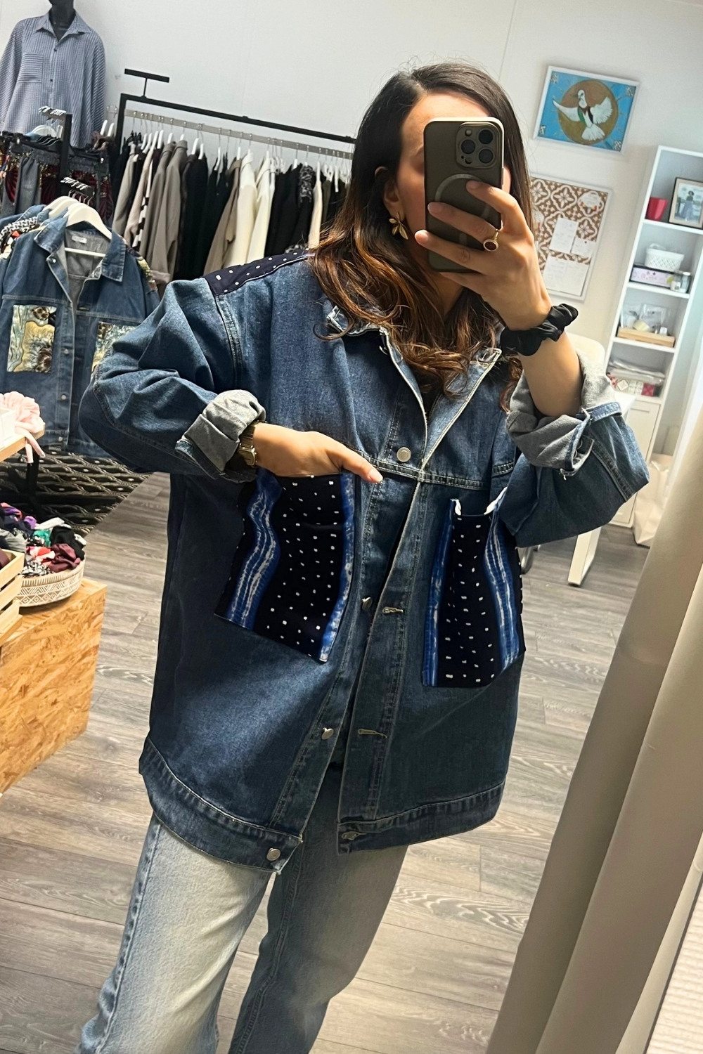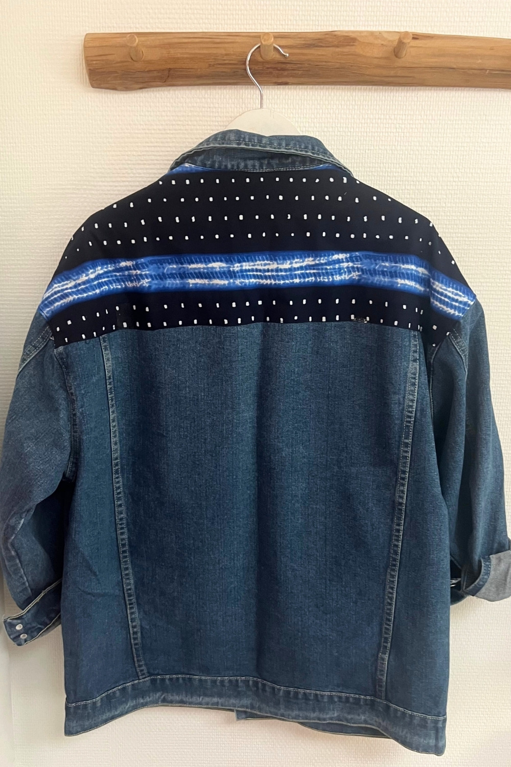 Les empiècements graphiques sur la poitrine et les épaules créent un contraste subtil entre le brut du jean et l’élégance du wax. Chaque pièce est customisée avec soin, ce qui rend votre veste absolument unique.