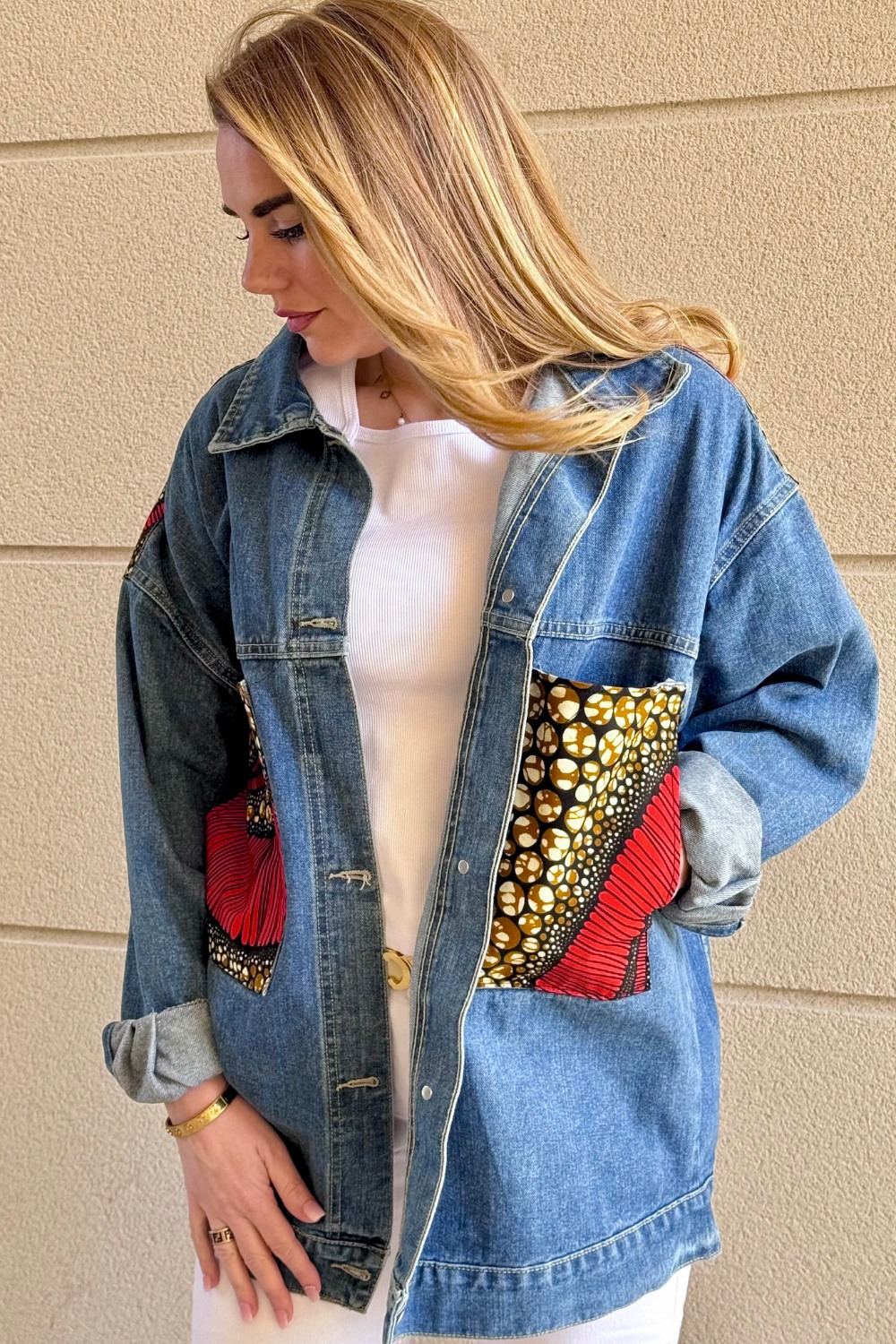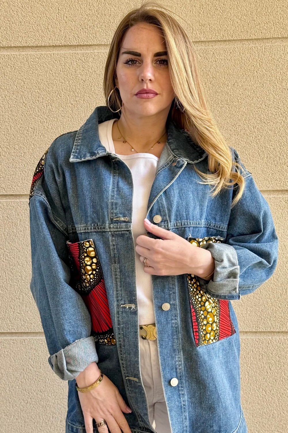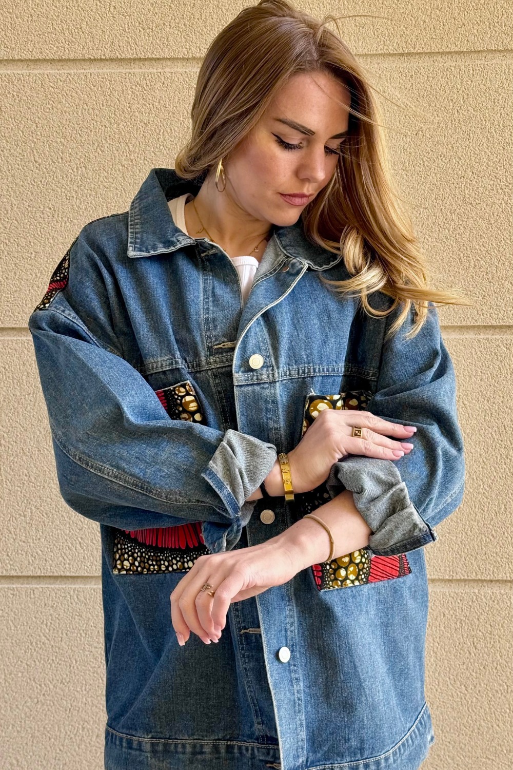 Cette veste en jean bleu foncé oversize est customisée à la main dans le dos et sur les poches avec un wax 100 % coton, aux motifs chaleureux Orange et Camel. Un contraste vibrant et original, qui fait toute la différence.