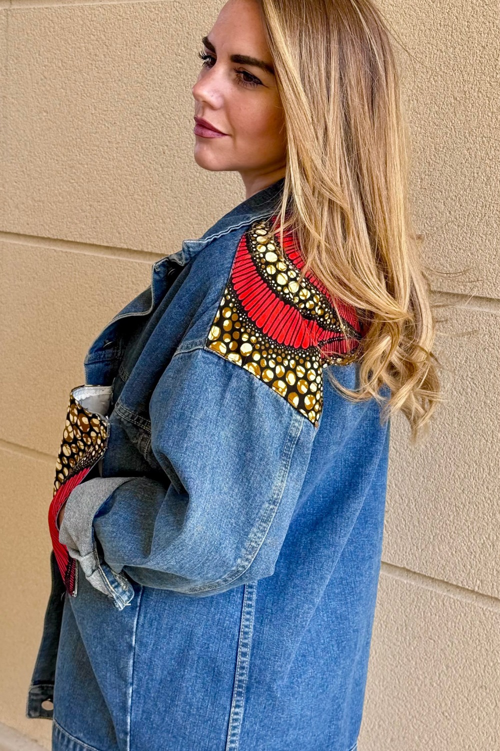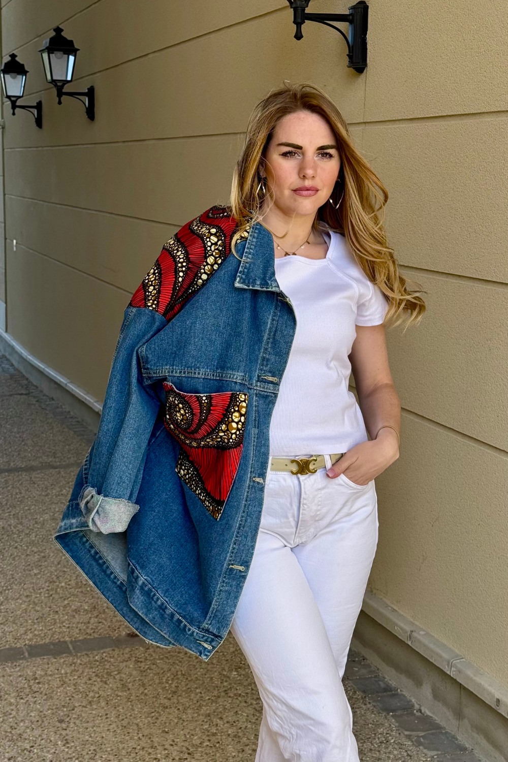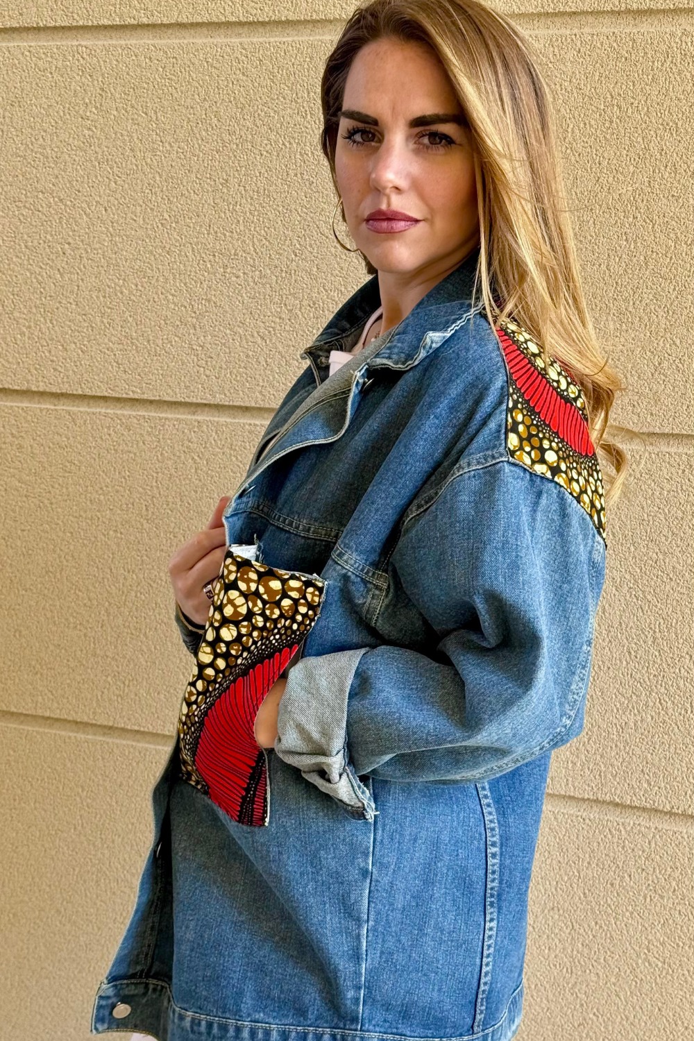 Cette veste en jean bleu foncé oversize est customisée à la main dans le dos et sur les poches avec un wax 100 % coton, aux motifs chaleureux Orange et Camel. Un contraste vibrant et original, qui fait toute la différence.